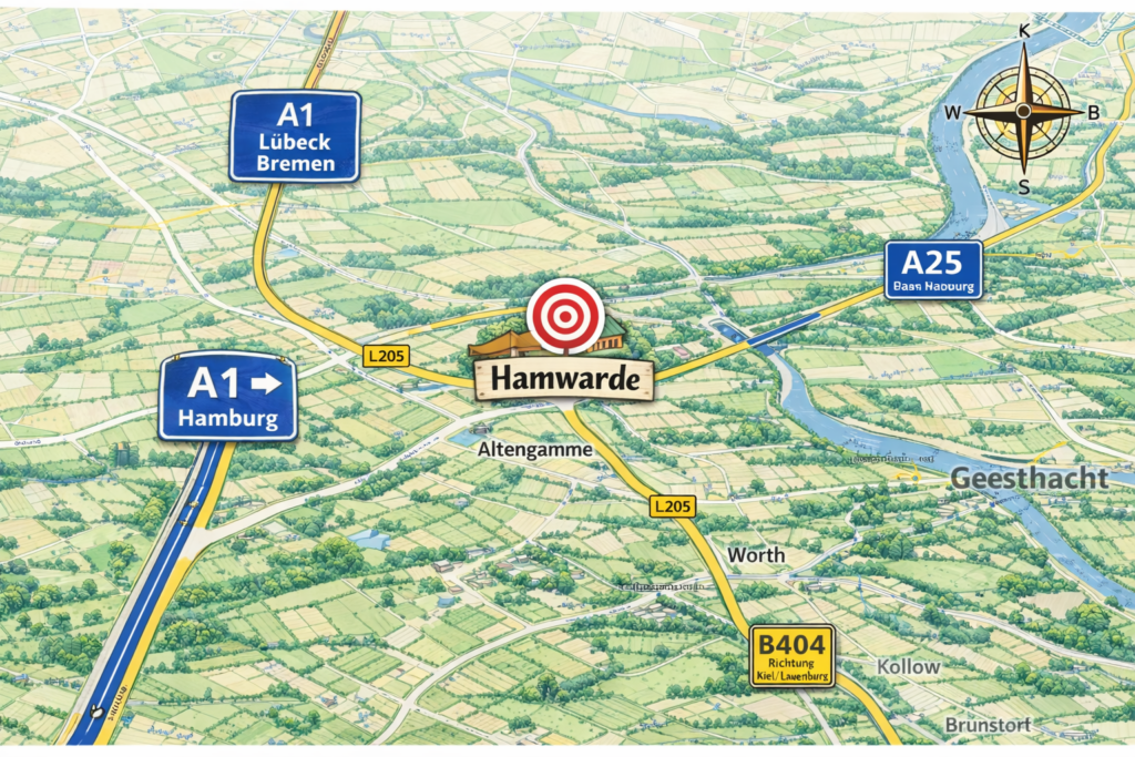 Von Hamburg über die A25 bis Geesthacht. Der B5 bis zu Edeka folgen und dann Richtung Hamwarde
